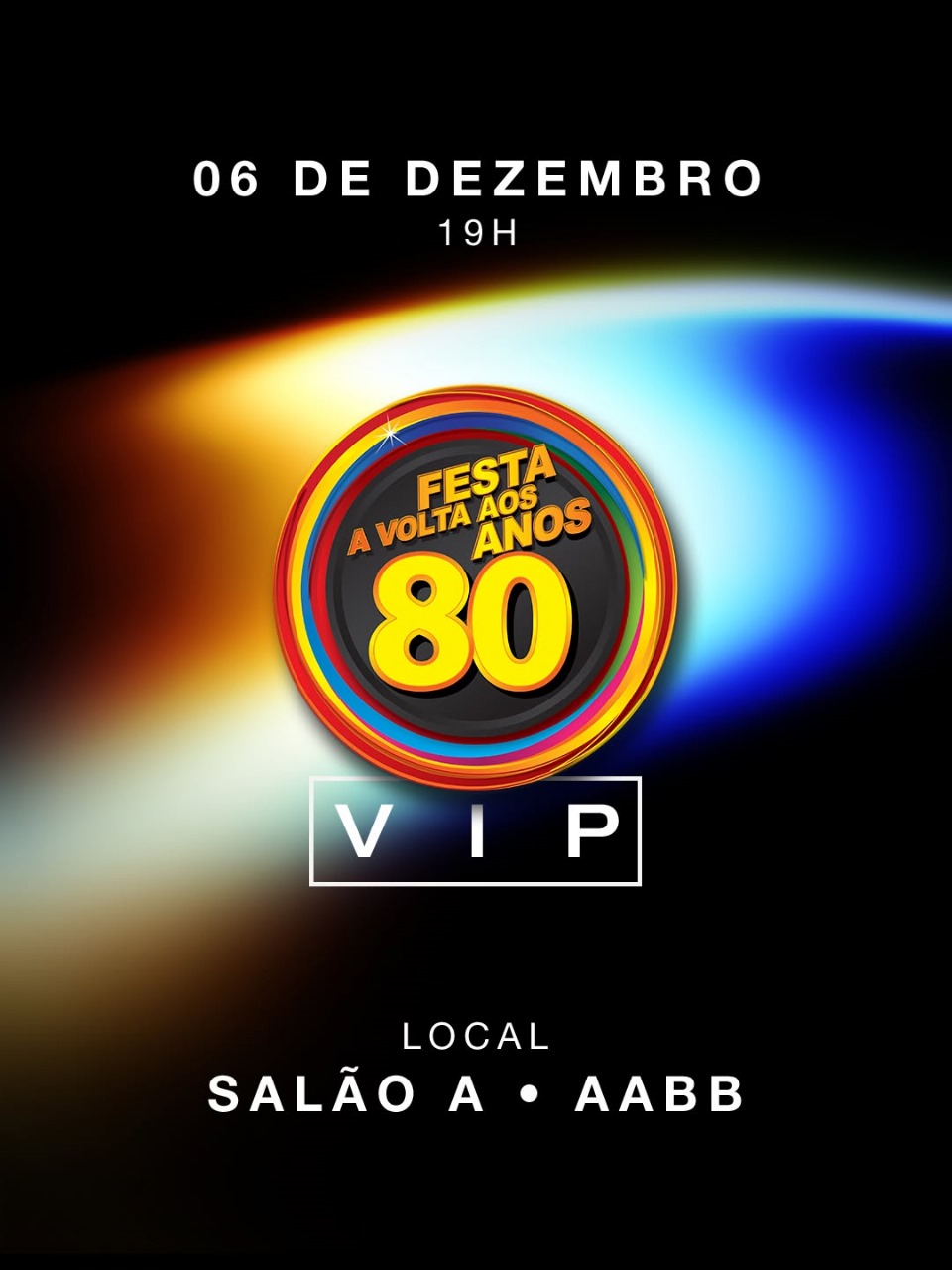 No dia 6 de dezembro, (sábado) a partir das 19h, o Salão A da AABB será tomado pela festa A Volta aos Anos 80 – VIP, trazendo toda a energia, o brilho e a nostalgia de uma década inesquecível. DJs tocarão os grandes clássicos que marcaram época, a decoração será temática e o ambiente pensado para quem realmente ama os anos 80.