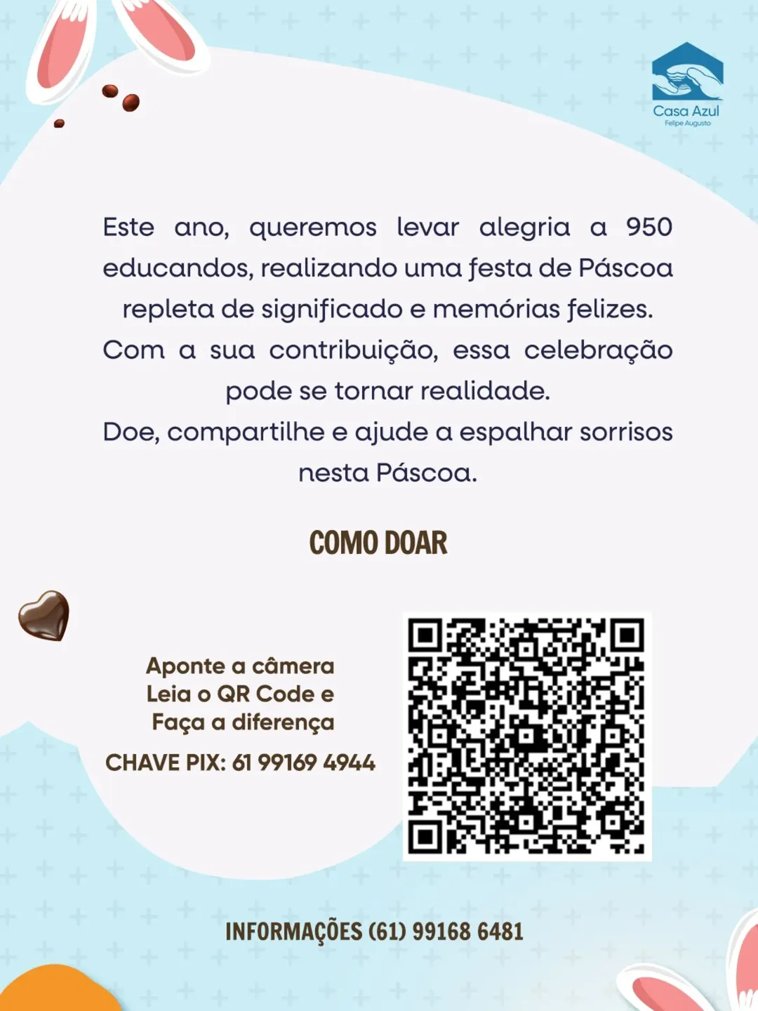 As contribuições podem ser feitas por meio de transferência via Pix, pela chave 61991694944. Segundo a organização, cada doação é fundamental para viabilizar a ação e ampliar o alcance da campanha. A iniciativa reforça o compromisso social da instituição e destaca a solidariedade como instrumento de transformação e cuidado coletivo.