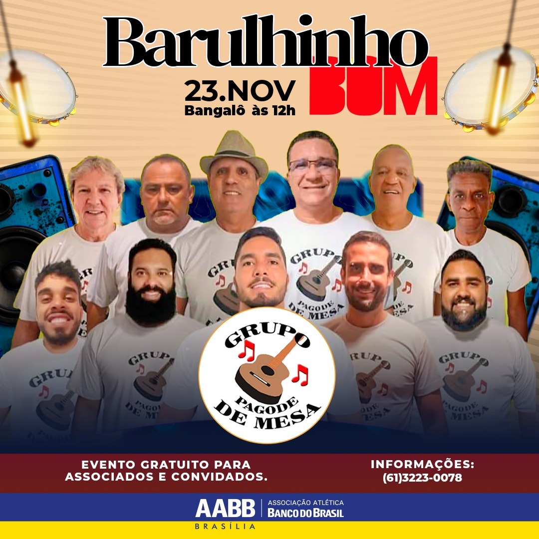 Neste domingo (23/11), a AABB Brasília promove mais uma edição do projeto Barulhinho Bom, a partir das 12h, no Bangalô. O Grupo Pagode de Mesa garante a trilha da tarde com um repertório repleto de sucessos de Zeca Pagodinho, Fundo de Quintal, Beth Carvalho, Arlindo Cruz, Exaltasamba e outros nomes que marcaram a história do samba e pagode.