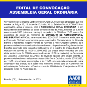 O Presidente do Conselho Deliberativo da AABB-DF, no uso das atribuições que lhe confere os Artigos 10, 13, inciso I e 15, inciso XI, do Estatuto Social, CONVOCA os Associados, aptos a votarem, para a ASSEMBLEIA GERAL ORDINÁRIA a ser realizada no hall de entrada do Salão Social da Sede da AABB, nos dias 25 e 26 de novembro de 2023 (sábado e domingo), no período de 09h00 às 17h00, com o fim específico de eleger os membros do CONSELHO DE ADMINISTRAÇÃO, DELIBERATIVO e FISCAL para o quadriênio 2024/2027. Comunica, ainda, que: a) a Comissão Eleitoral será formada pelos associados Roberto Meira de Almeida Barreto (Presidente), Rogério Vereza de Azevedo e Atílio Gregório Santana; b) o processo eleitoral será conduzido de acordo com o dispositivo no Regulamento das Eleições aprovado pelo Conselho Deliberativo; c) o registro de chapa deverá ser efetuado no período de 18/09 a 26/09/2023 (os prazos serão contados em dias úteis, iniciando-se às 09h00 e encerrando-se às 18h00 de cada dia), na Secretaria do Conselho Deliberativo da AABB; d) havendo apenas uma chapa inscrita, o processo eleitoral será realizado em Assembléia Geral Ordinária, no dia 25/11/2023, às 11h00, em primeira convocação, e ás 11h30, em segunda convocação, para aclamação dos eleitos; e) a posse dos membros eleitos para os Conselhos de Administração, Deliberativo e Fiscal ocorrerá às 19h00 do dia 1° de janeiro de 2024 (segunda-feira), na AABB Brasília.