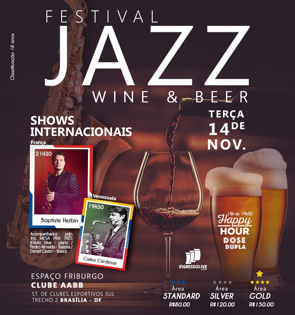 Reunindo as maiores paixões nacionais, o FESTIVAL JAZZ, WINE & BEER convida você para uma experiência única em uma noite que reúne o melhor do Jazz (com dois shows internacionais com artistas renomados: o saxofonista francês Baptiste Herbin e o saxofonista venezuelano Carlos Cárdenas) e o melhor do vinho e da cerveja.