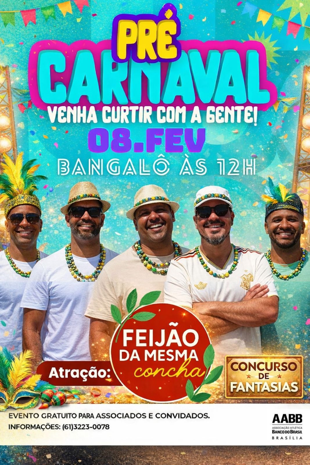 No comando da roda de samba, o grupo Feijão da Mesma Concha apresenta sucessos dos grandes mestres da música brasileira, pagodes inesquecíveis e clássicos do carnaval brasileiro em releituras exclusivas. O evento é gratuito para associados e convidados. Reúna a família e os amigos e venha celebrar conosco em uma tarde de muita energia e alegria.