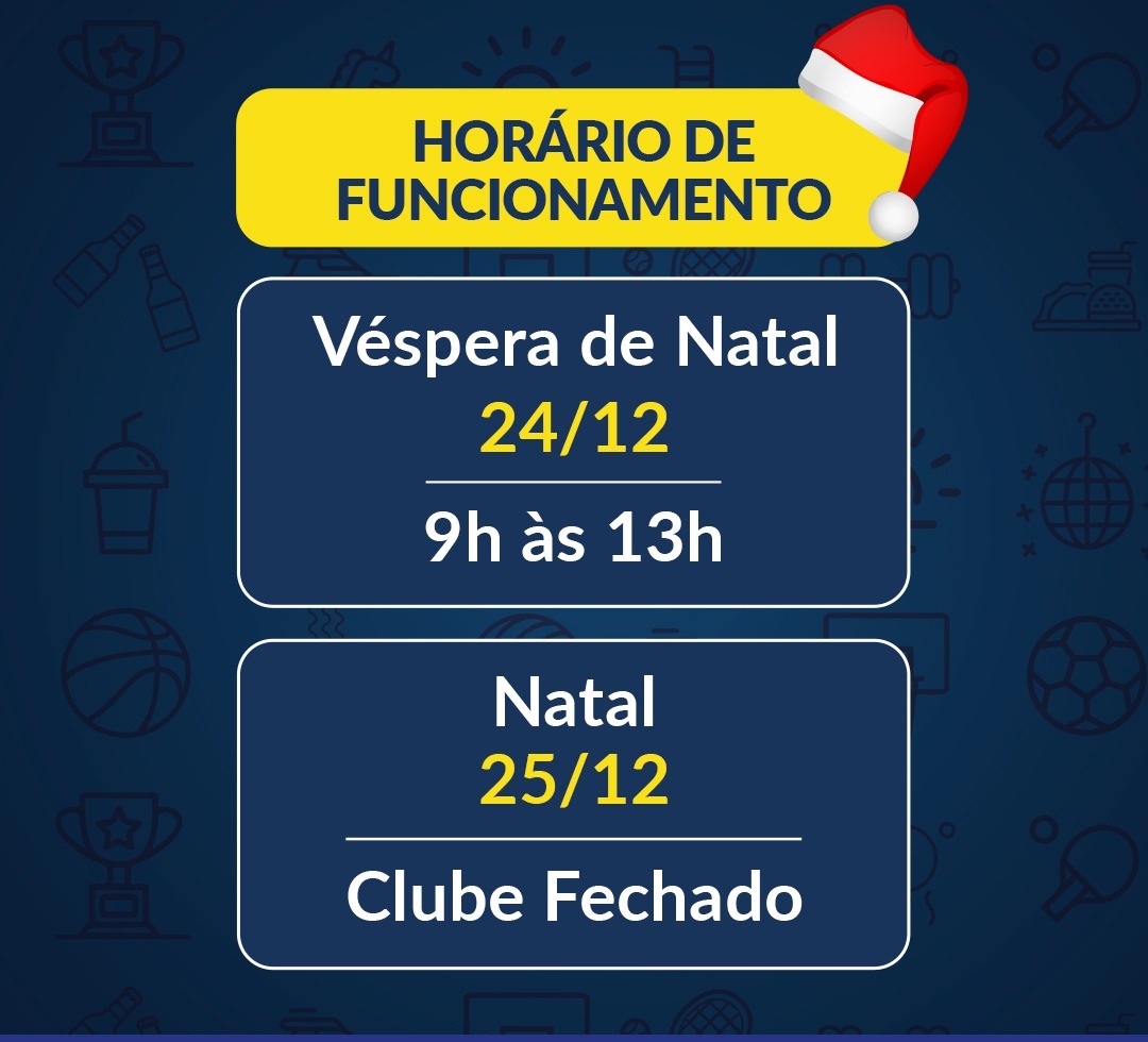 HORÁRIOS DE FUNCIONAMENTO EM 24 E 25/12 Na véspera de Natal (24/12), o clube estará aberto das 9h às 13h. Já em 25 de dezembro, o clube estará fechado Notícias Atualizado 26 dez, 2024 368 Compartilhar Agradecemos a compreensão de todos. 368 Compartilhar