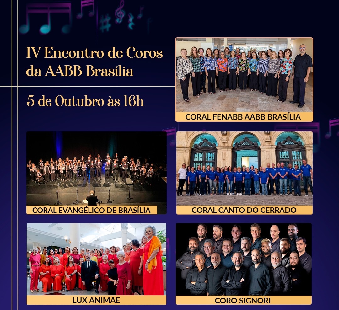 Evento contará com apresentações do Coral FENABB AABB Brasília, Coral dos Aposentados do Sindicato dos Bancários de Brasília, Coral Feminino Vozes em Pauta, Coral Nosso Canto e Coral Voz e Sentimento