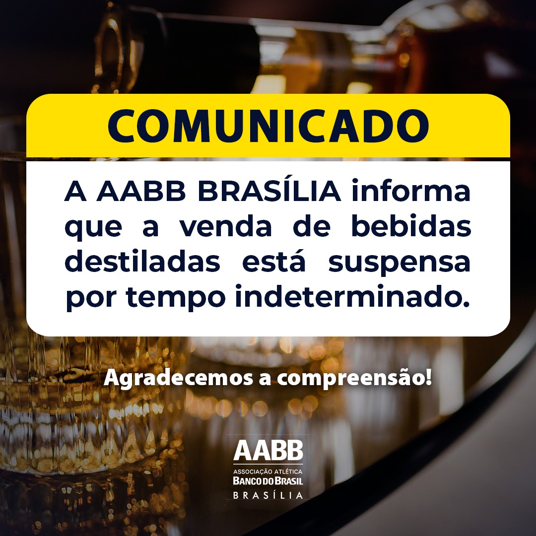 A Diretoria da AABB Brasília informa que, por medida de segurança, está suspensa temporariamente a venda de bebidas destiladas em todos os pontos do Clube.
