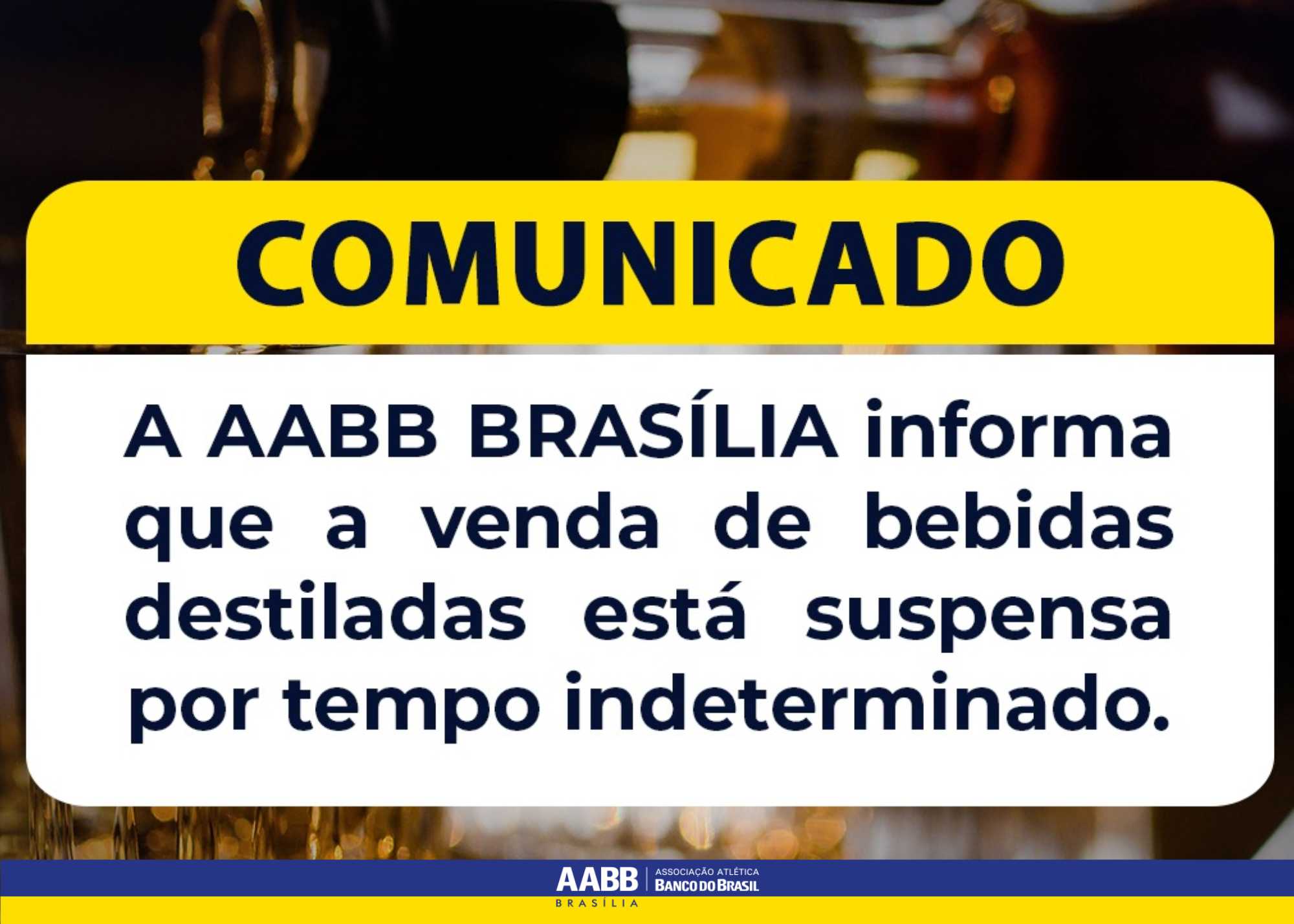 Na AABB Brasília, a segurança e o bem-estar dos nossos associados e convidados estiveram e estarão sempre acima de qualquer outra consideração. Por isso, na semana passada, decidimos suspender temporariamente a venda de bebidas destiladas em todos os pontos do clube. A medida preventiva permanecerá por prazo indeterminado, sendo retomada tão logo a normalidade seja restabelecida e os órgãos responsáveis atestem a segurança. Essa ação reforça nosso compromisso com a saúde coletiva e a responsabilidade social.